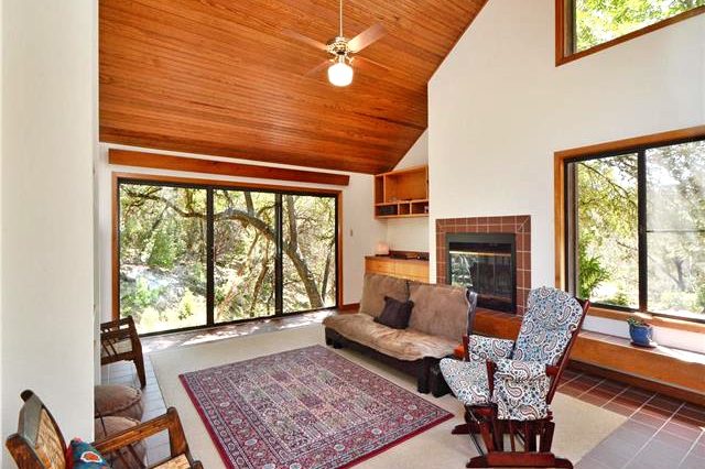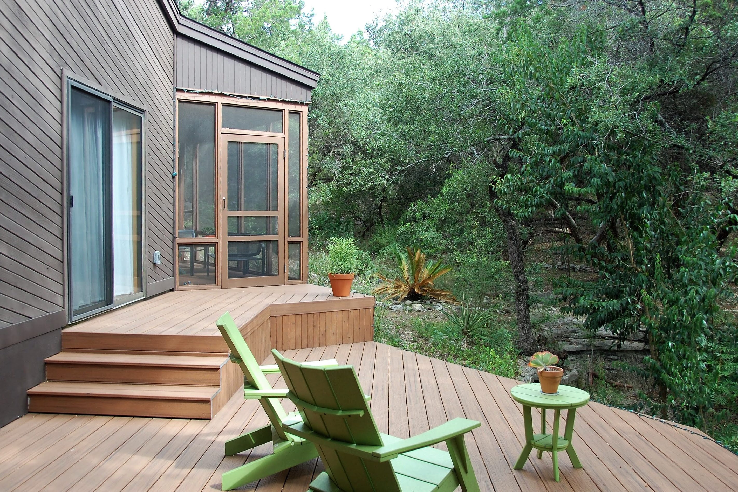 A new deck and screened-in porch overlook the dry creek bed and expansive green space beyond, offering varied options for outdoor entertaining.